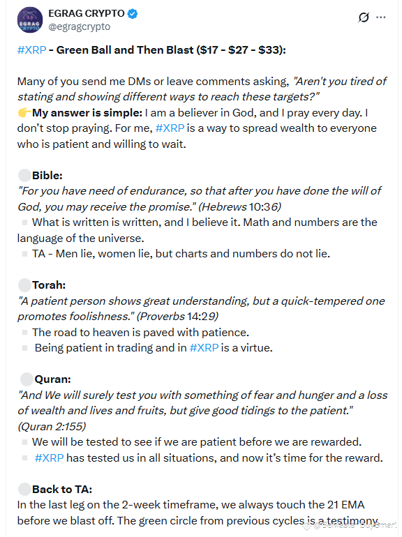 The most unique element of his very recent message is a spiritual touch, which ordinarily does not feature in technical analysis. Egrag had defined XRP as a method of diffusing wealth to all who are patient and ready to wait. He connected the concept of patience in markets with Bible, Torah, and Quran teachings.