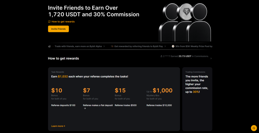 Bybit’s incentive structure has two primary levers: attracting new traders through referrals and maintaining high trading volume through VIP bonuses, promotions, and competitions. Here’s how the advantages work and what you should look for.