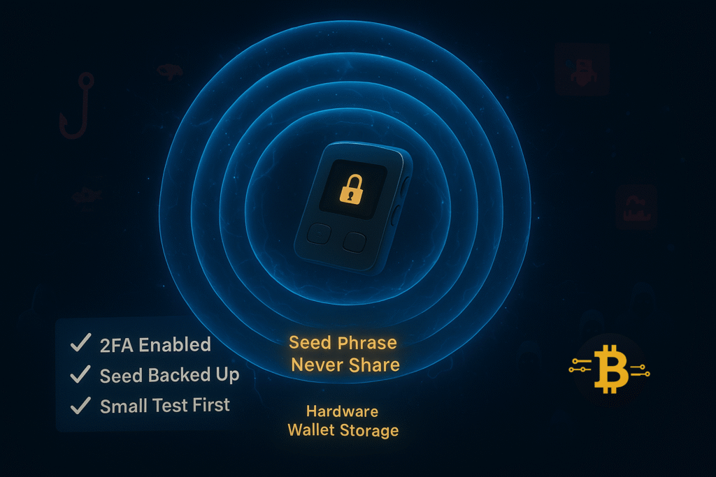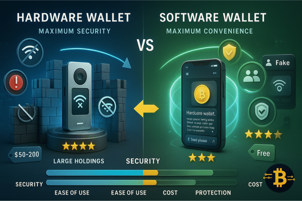 General rule: Use hardware wallets for long-term savings (your “crypto bank account”) and software wallets for spending money (your “crypto checking account”). This two-wallet strategy balances security with convenience.