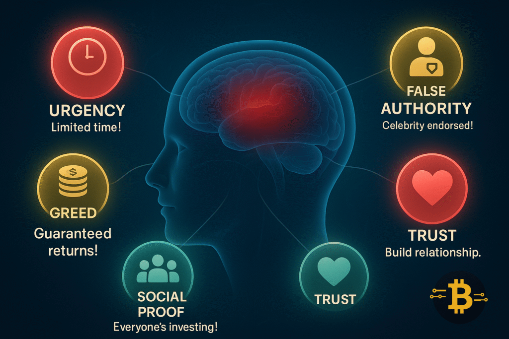 Understanding how crypto scammers work psychologically helps you recognize manipulation tactics before you become a victim. Scammers use proven psychological triggers that bypass logical thinking. Here are the five main tactics: