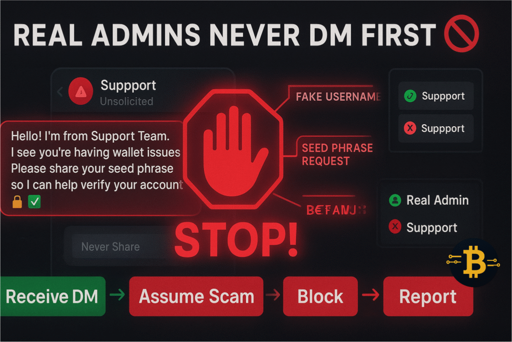 Critical rule: Real admins, support teams, and project founders never message you first on any platform. If someone claiming to be support contacts you unsolicited, it’s a scam 100% of the time.